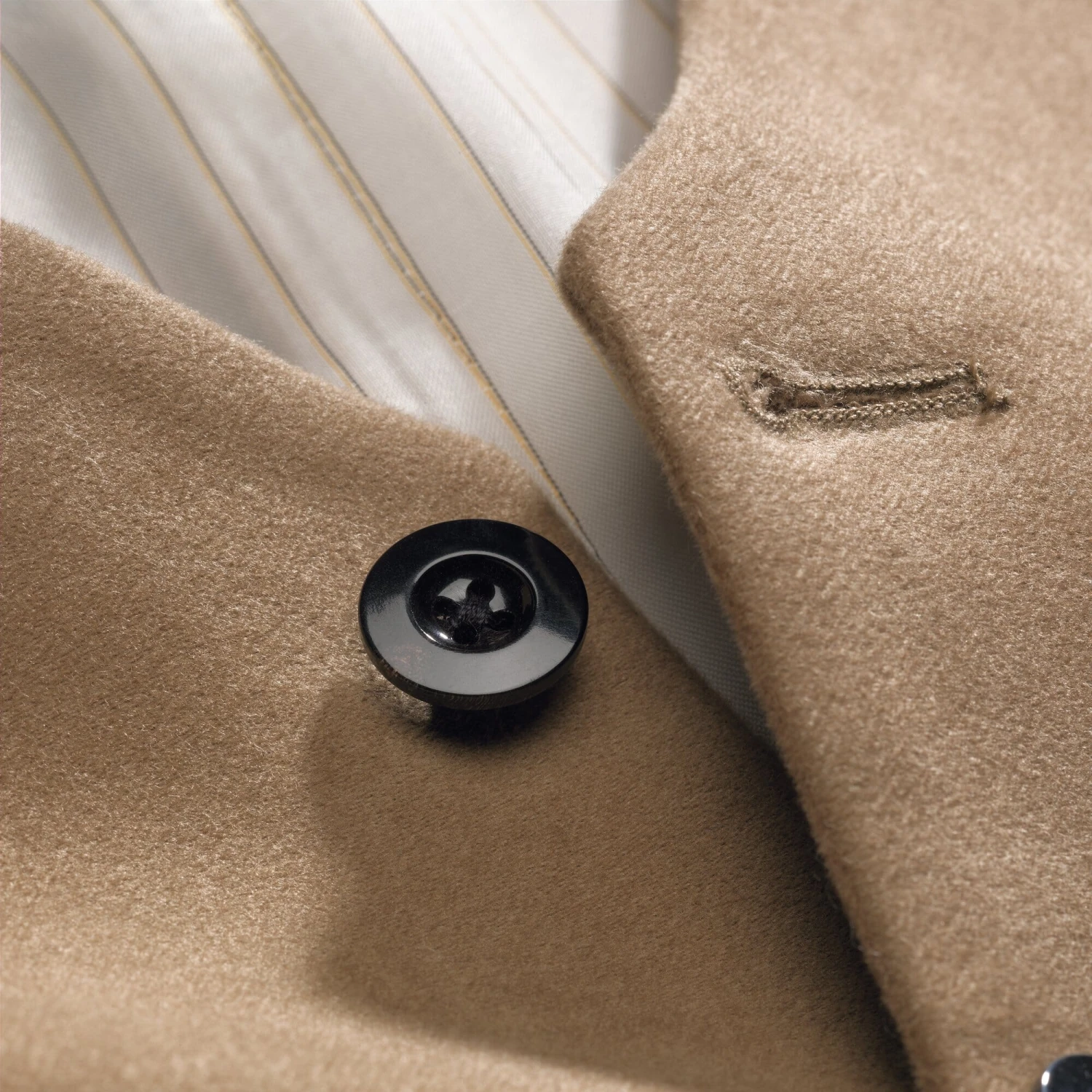 100% katoen. Voering 100% viscose. Bevat niet uit textiel bestaande delen van dierlijke oorsprong: Echte hoornknopen. Twee klepzakken voor, achterband met metalen giletgesp. Gemaakt in Europa. Ruglengte in maat 52 = 59 cm.