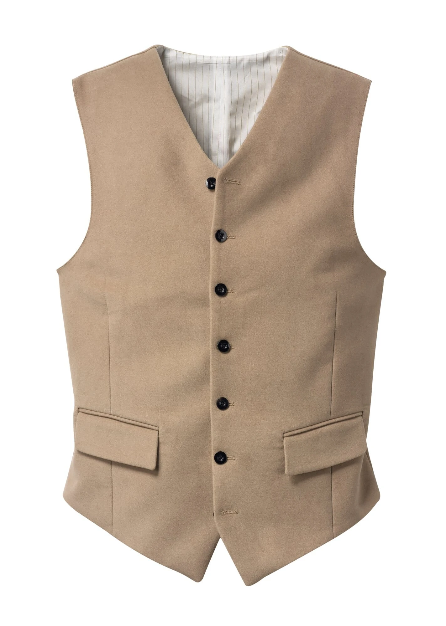 Tailor Hoff Dit eenrijige vest met hoge knoopsluiting is gemaakt van een zware moleskin van Kindermann, een weverij die gespecialiseerd is in dergelijke stoffen. Het heeft niet de gebruikelijke gevoerde rug, maar is geheel van moleskin; de rugband kan worden versteld met een giletgesp.