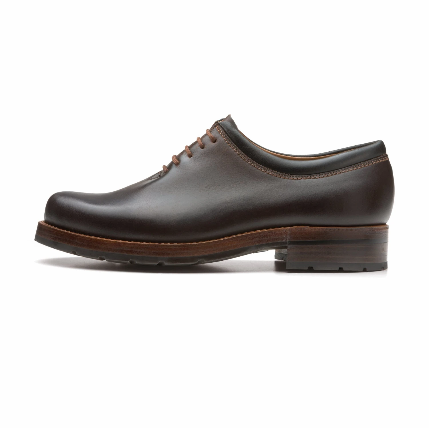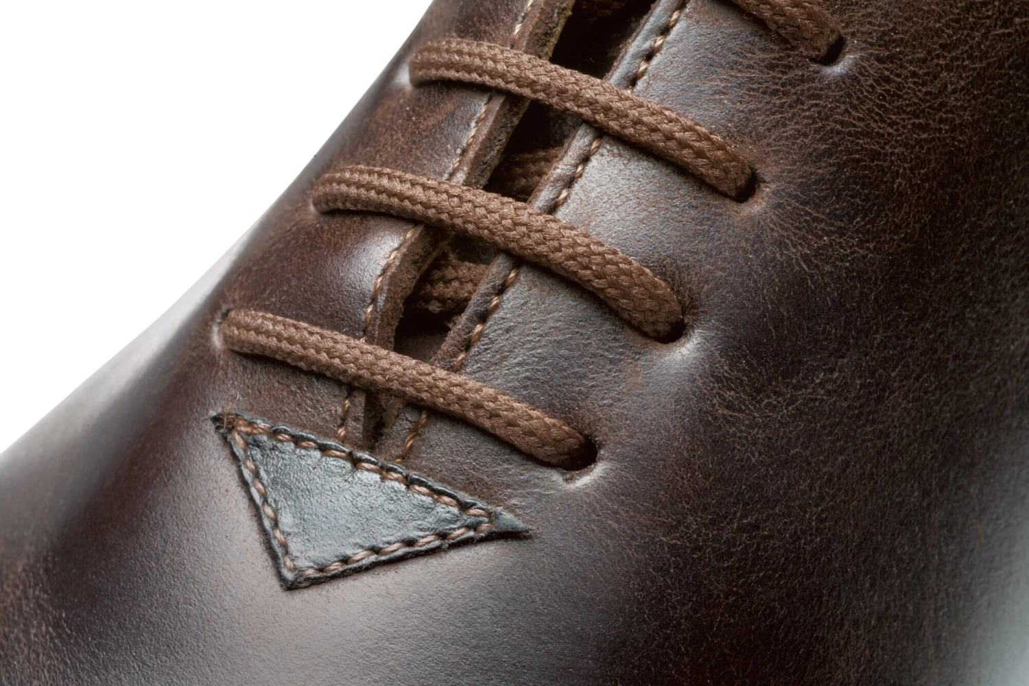 Het eerste wat opvalt aan de welted “One cut” schoen is dat hij slechts één zorgvuldig bewerkte naad heeft (de “one cut”) bij de hiel. Dit komt omdat het gemaakt is uit één stuk bovenleer, een ruw kalfsleer dat alleen is gladgemaakt door het in te borstelen met was. Een schachtrandvulling van hetzelfde leer, gevuld met natuurlijke latex, ondersteunt de uitstekende pasvorm van de schoen – drukpunten op de voet zijn bij dit type afwerking met slechts één naad vrijwel uitgesloten. In zijn ontwerp doet de robuuste lage herenschoen denken aan de traditionele Alpine werkschoen. Het kalfsleer van dit model krijgt geen patina, maar een structuur die door borstelen kan worden verwijderd. Het leer kan weer worden opgepoetst met donkerebrauner, slechts licht dekkende schoensmeer.