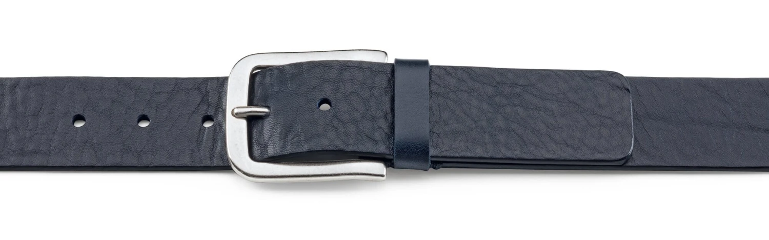 Enkele laag. Runderhuid (dikte 3,5 mm), plantaardig gelooid. Messing gesp verzilverd. Gemaakt in Duitsland. Breedte 4 cm.
