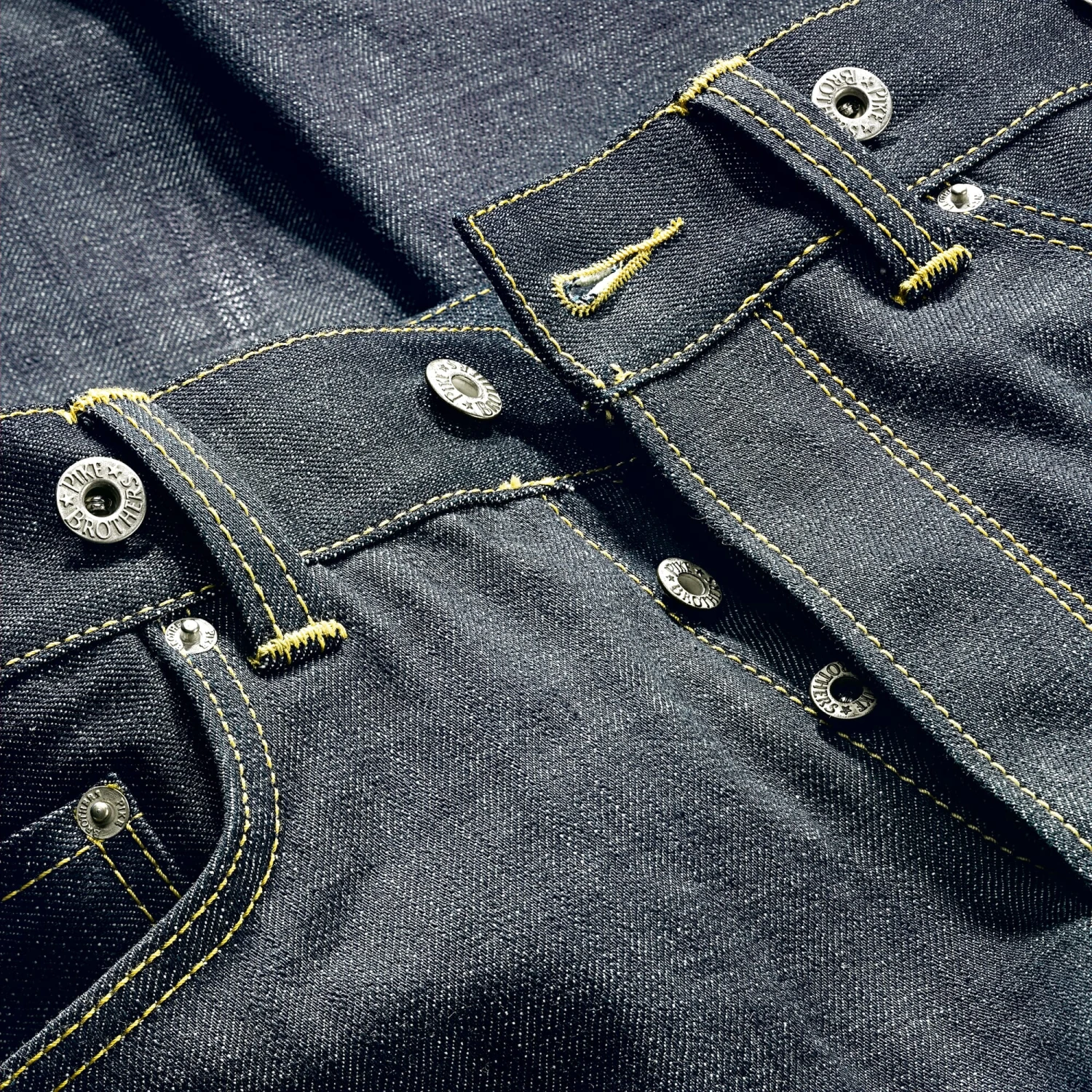 100% katoen. Metalen klinknagelknopen en sluiting. Gemaakt in Turkije. Raw denim 11 oz, niet voorgewassen.