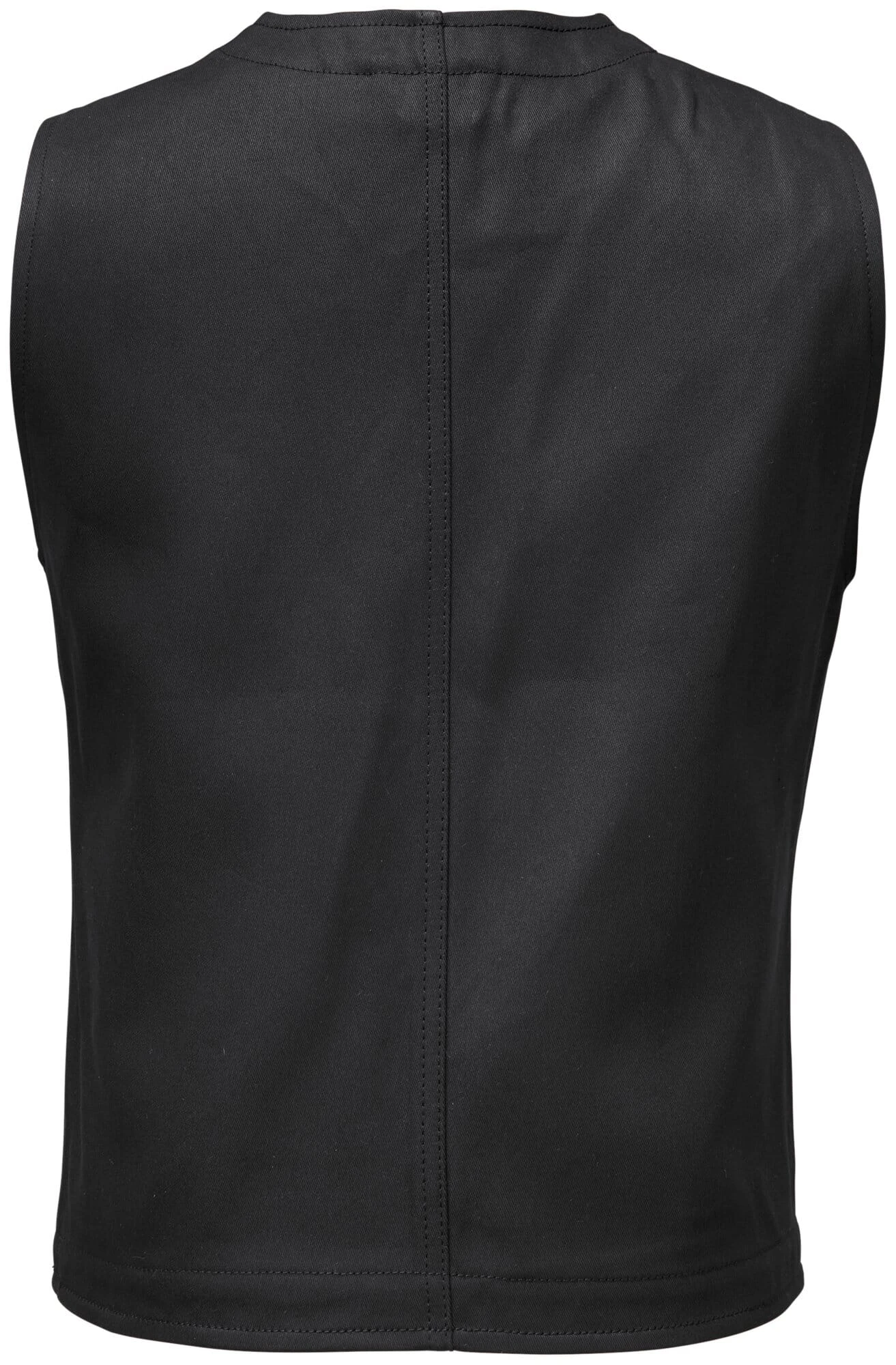 Dit gilet zonder kraag is geheel gemaakt van een zware katoenen stof en gevoerd met zwart katoen. Er zijn drie zakken aan de voorkant en de achterkant is verdeeld door een opvallende middennaad.