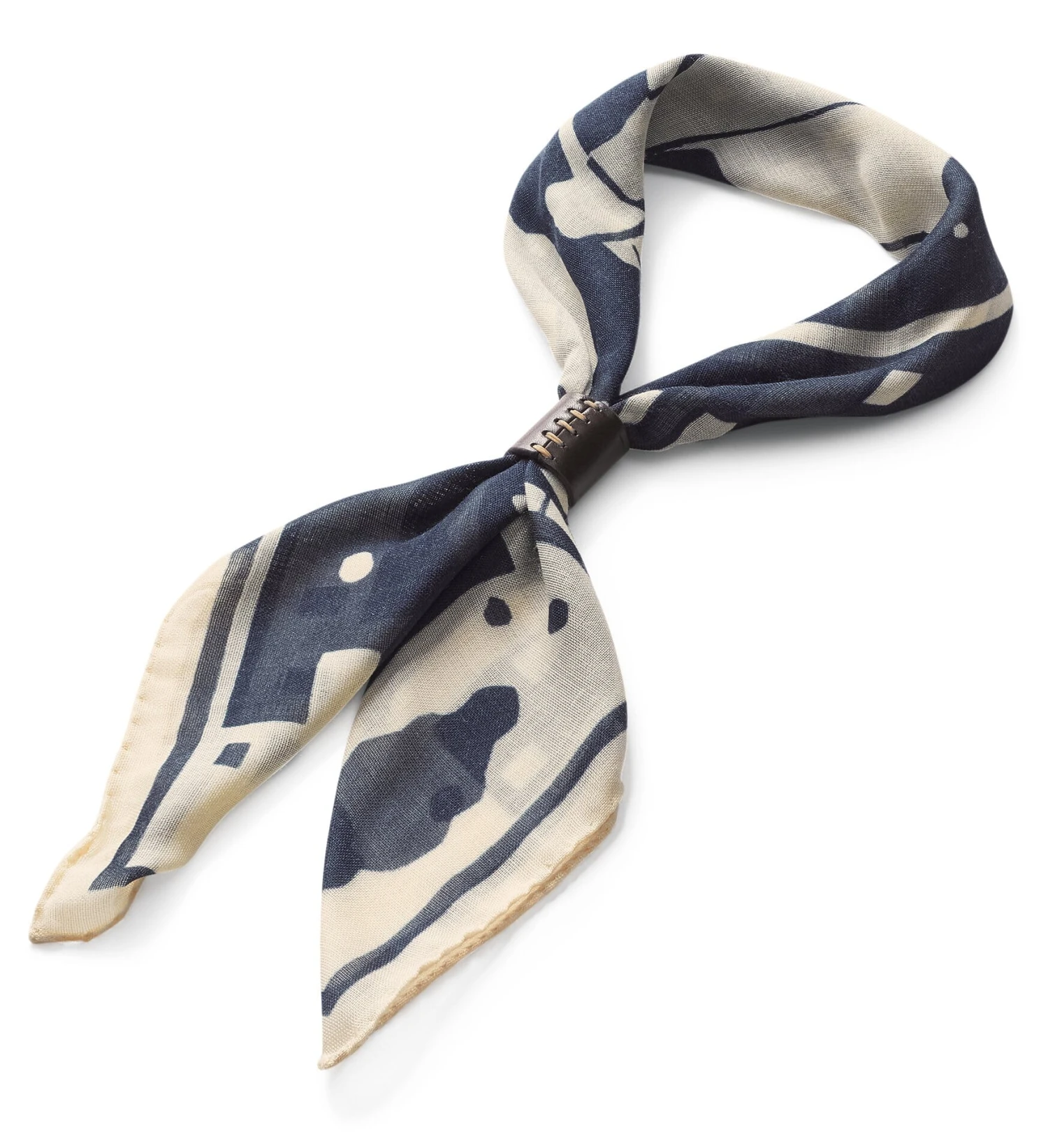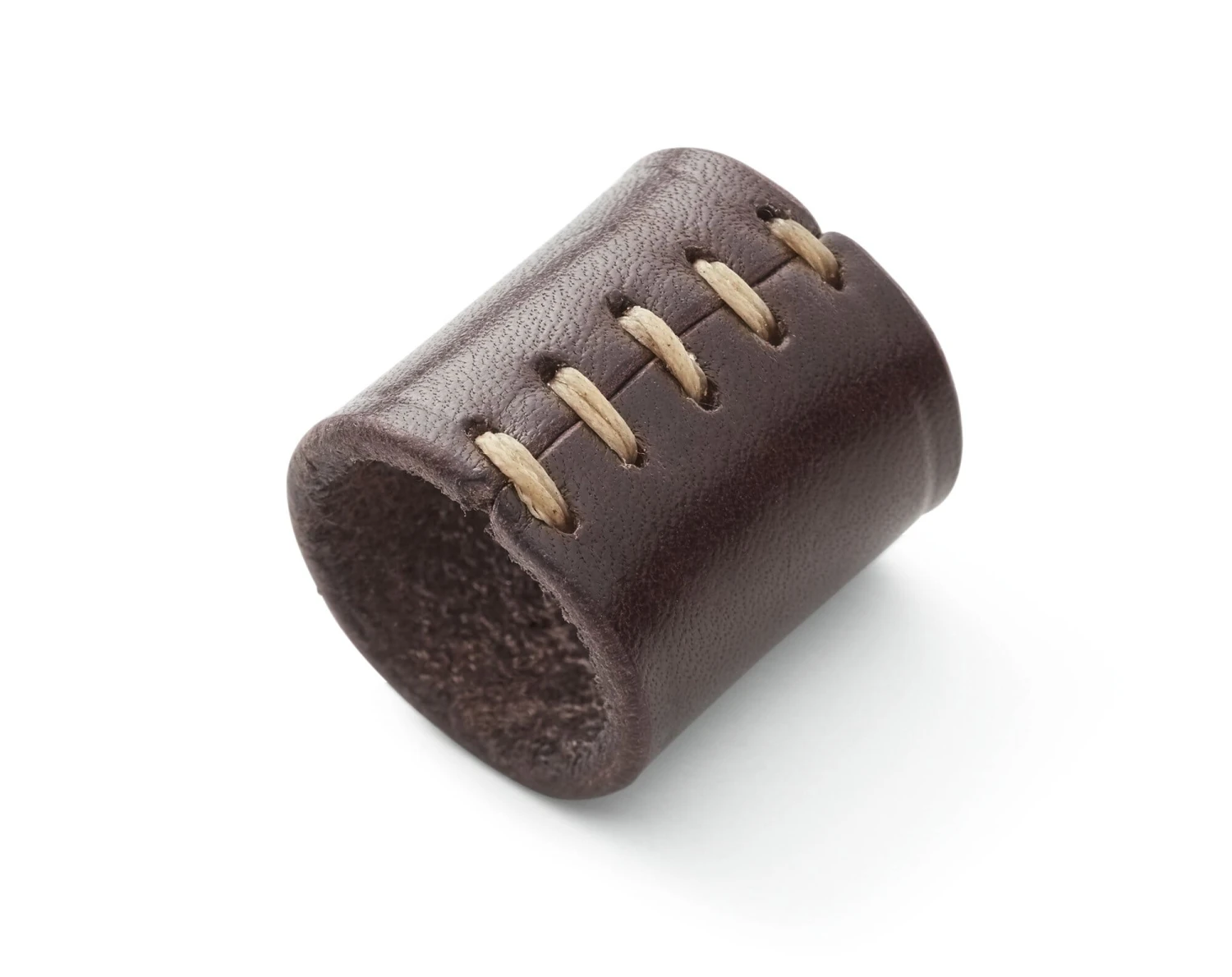 Een strook leer die in een ring is genaaid met een kenmerkende zadelmakerssteek, die wordt gebruikt in plaats van een knoop om de halsdoek te knopen en er tegelijkertijd voor zorgt dat deze altijd goed past. Het plantaardig gelooide leer komt uit een Duitse looierij.