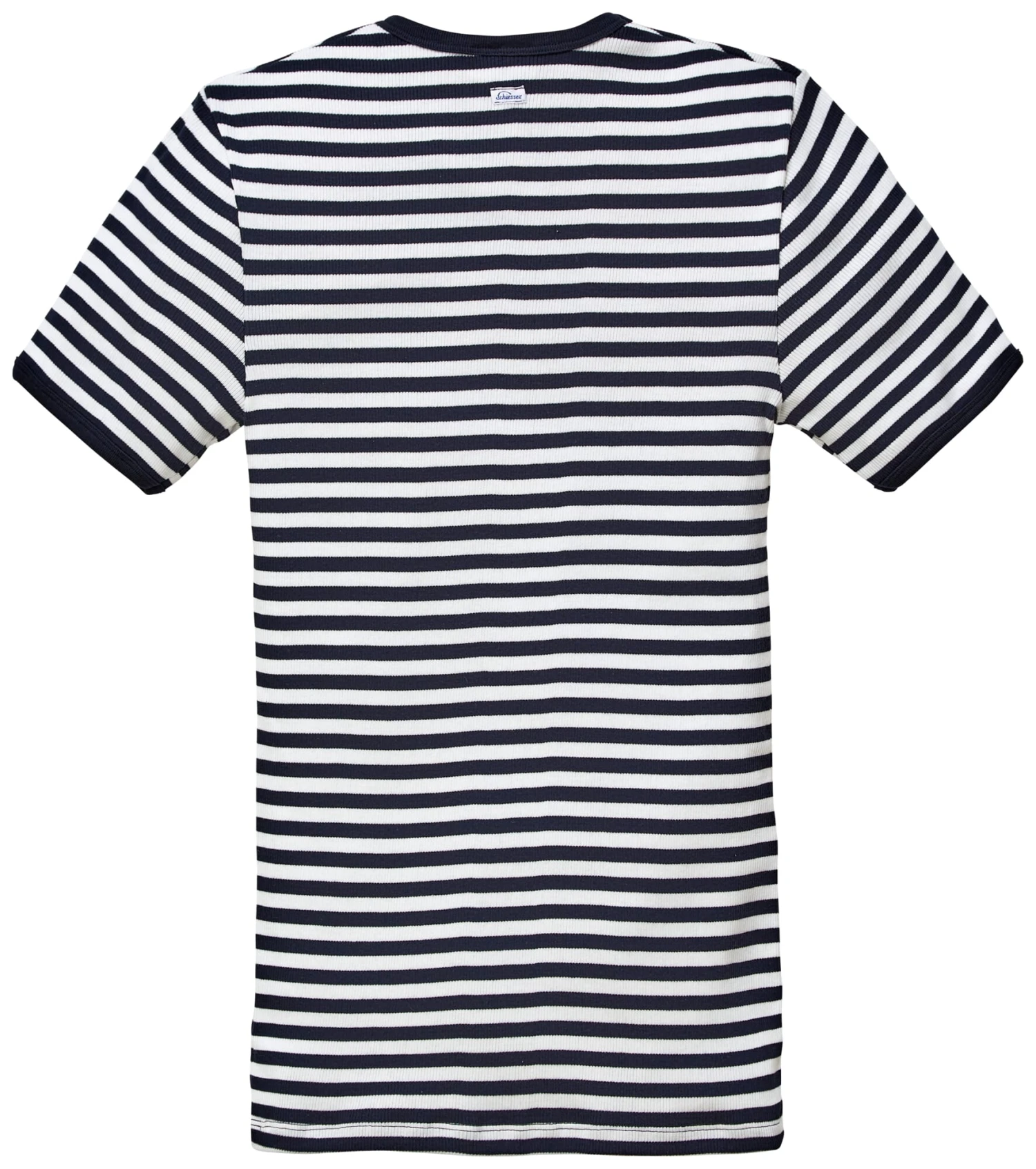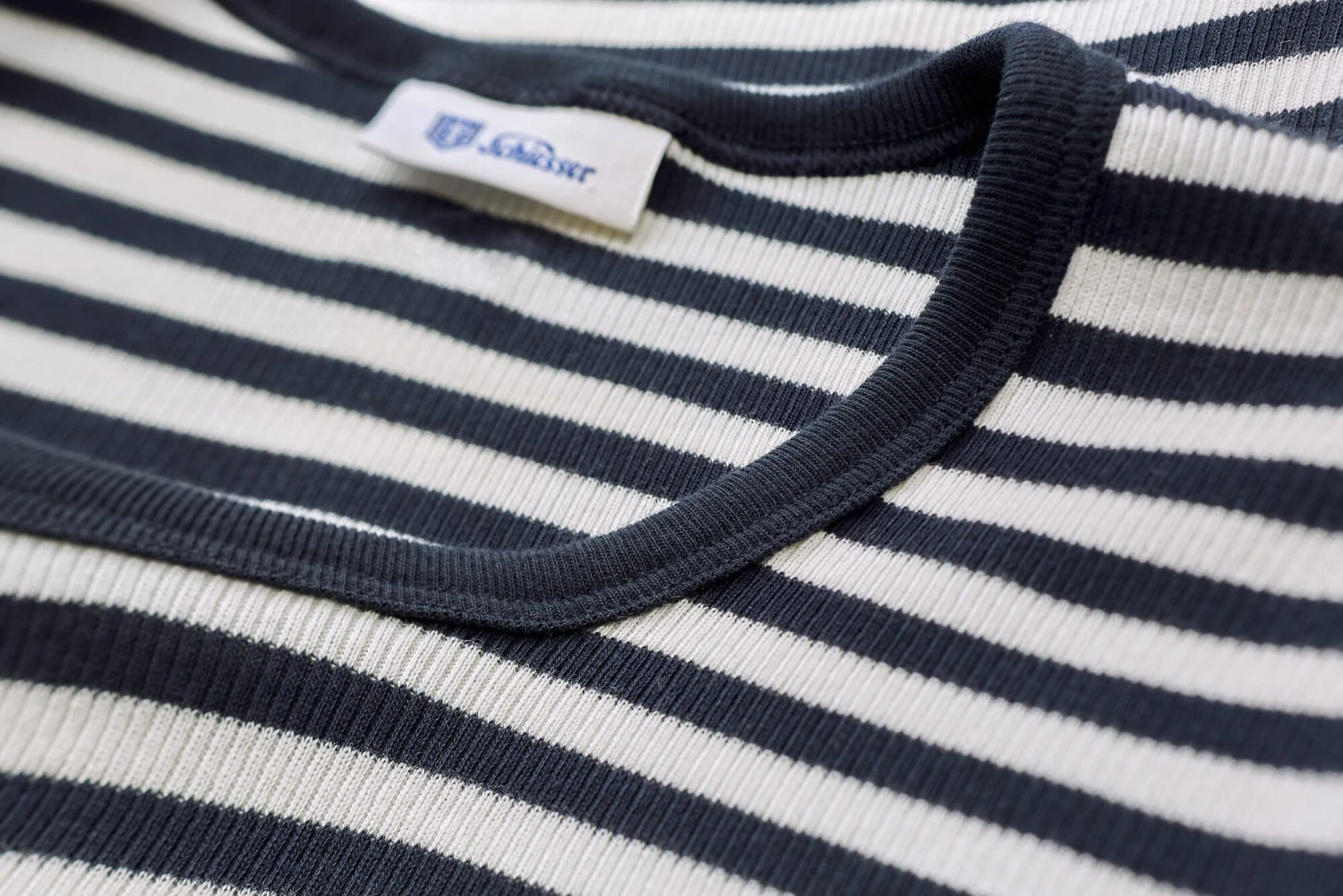 Schiesser heeft in zijn lange geschiedenis een aantal iconische stijlen geproduceerd, waarvan sommige in de Revival-serie nieuw leven worden ingeblazen. Een daarvan is dit overhemd met dubbele ribben, waarvan de formele oorsprong ligt in het begin van de jaren vijftig. Dubbel rib heeft niet alleen een meer kenmerkende structuur dan fijn rib door de royale rijvorming in de steken, het heeft ook een hogere elasticiteit en sluit dus ideaal aan op het lichaam – en dat zonder enige elastaan. Het shirt heeft een opvallend streepjespatroon en is ook afgebiesd bij de mouwen en hals.