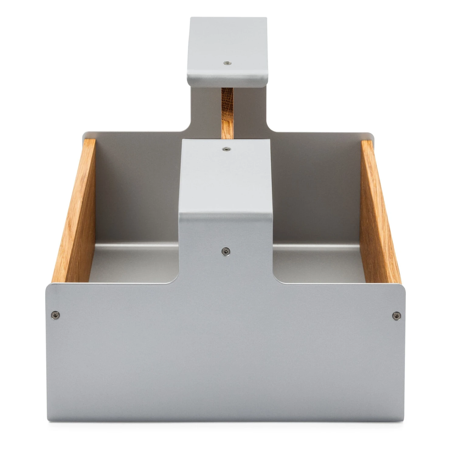 Geolied eikenhout en gepoedercoat plaatstaal. Gemaakt in Duitsland. Breedte 35 cm, diepte 27 cm, hoogte 22 cm. Gewicht 3 kg.