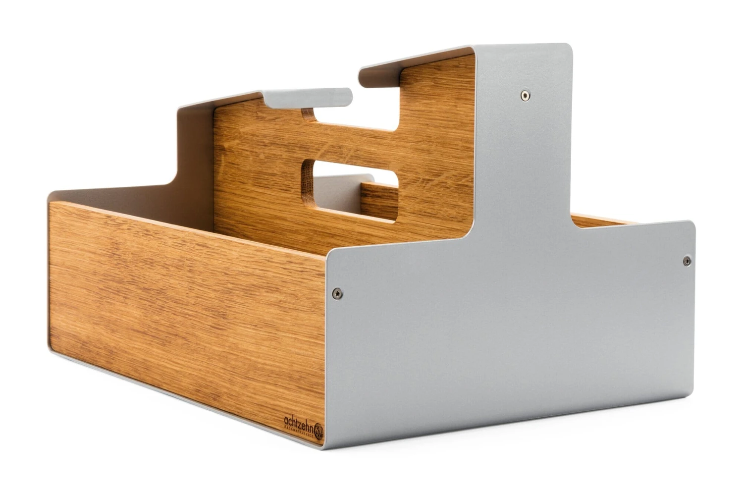 Deze handgemaakte schoenpoetsdoos van 10 mm dik eikenhout en 1,8 mm dik plaatstaal is ontworpen als een open kubus, bewerkt met afgeronde hoeken en stevig in elkaar geschroefd. De twee vakken bevatten alles wat je nodig hebt om je schoenen te verzorgen. Het doordachte ontwerp culmineert in de centrale draaggreep, die tevens dient als schoenenrek voor comfortabel schoonmaken, de greepopening heeft een breedte van 11 cm. Met dit solide apparaat – men zou eerder willen zeggen: klein meubelstuk – wordt regelmatige schoenverzorging een tastbaar en zichtbaar genoegen. De schoenpoetsdoos wordt vervaardigd in de werkplaatsen voor gehandicapten in Bethel.