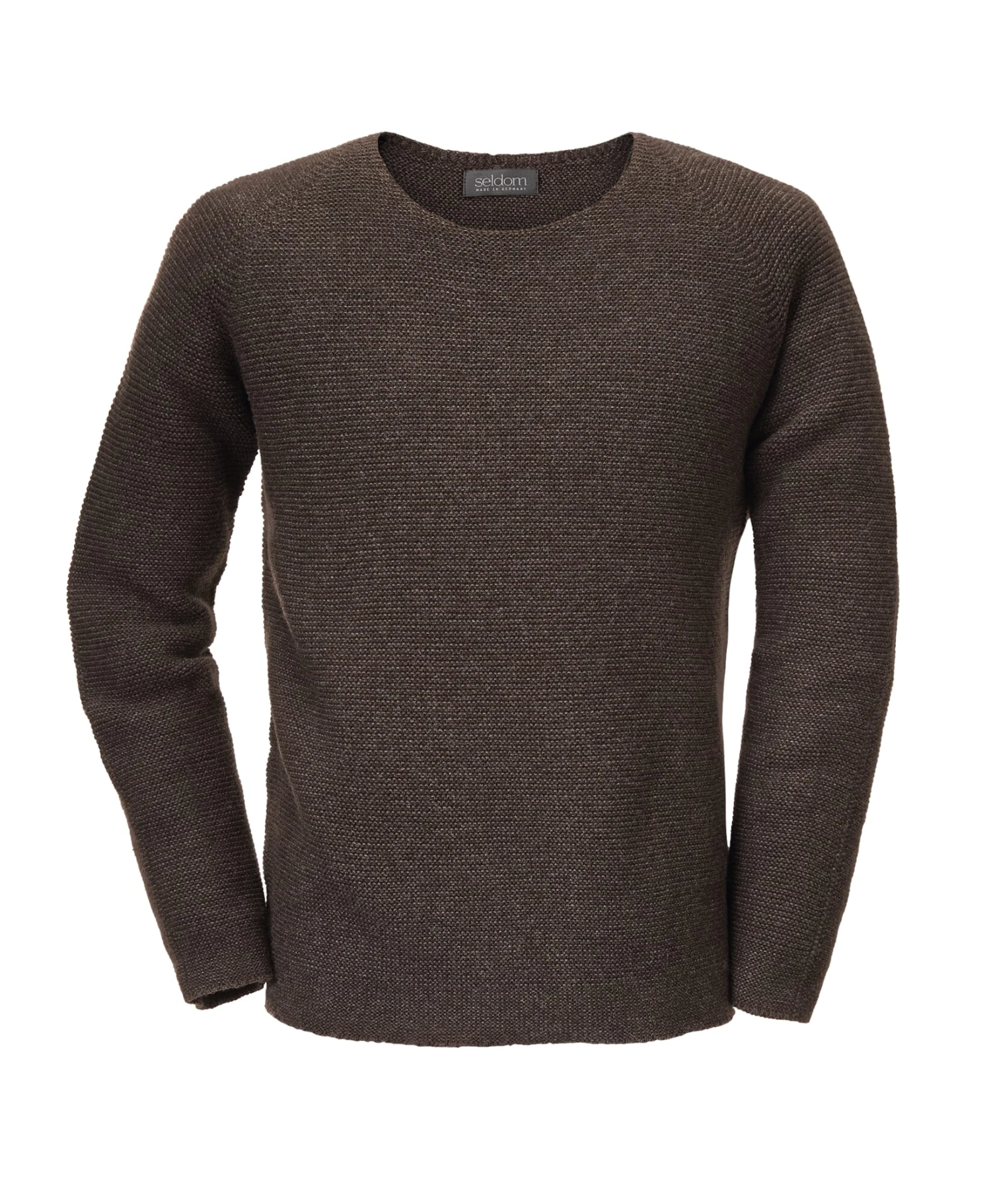 Voor deze trui met ronde hals en brede ribbels gebruikt Seldom garens uit een kleine spinnerij in Noord-Italië, die exclusief voor de breispecialist uit Westerwald in deze kwaliteit worden geproduceerd. Voor de productie ervan wordt gecertificeerde biologische merinowol met lange vezels gesponnen in een gekaard garenproces. Het gepatenteerde spinproces zorgt ervoor dat de trui nauwelijks neigt tot pilling. Het links-links breiproces met twee verschillende kleuren zorgt voor de speciale melangetint. Aan de achterkraag is een manchet aangebracht.