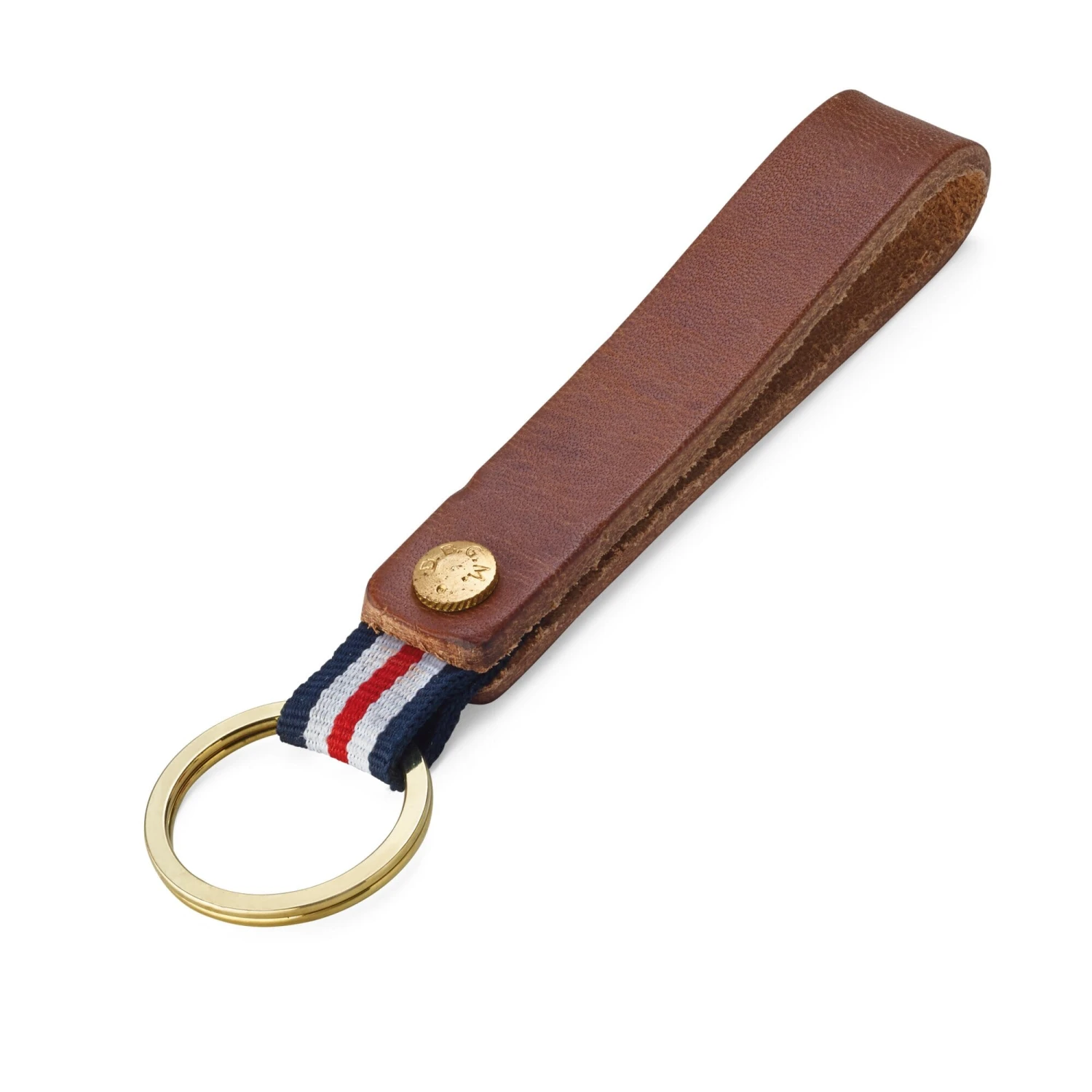 Runderhuid, plantaardig gelooid, herkomst Duitsland. Lus van polyester. Sleutelhanger (Ø 2,5 cm) van messing verend staal, messing boekschroef. Gemaakt in Duitsland. Breedte 1,7 cm, totale lengte 13 cm. Gewicht 15 g.