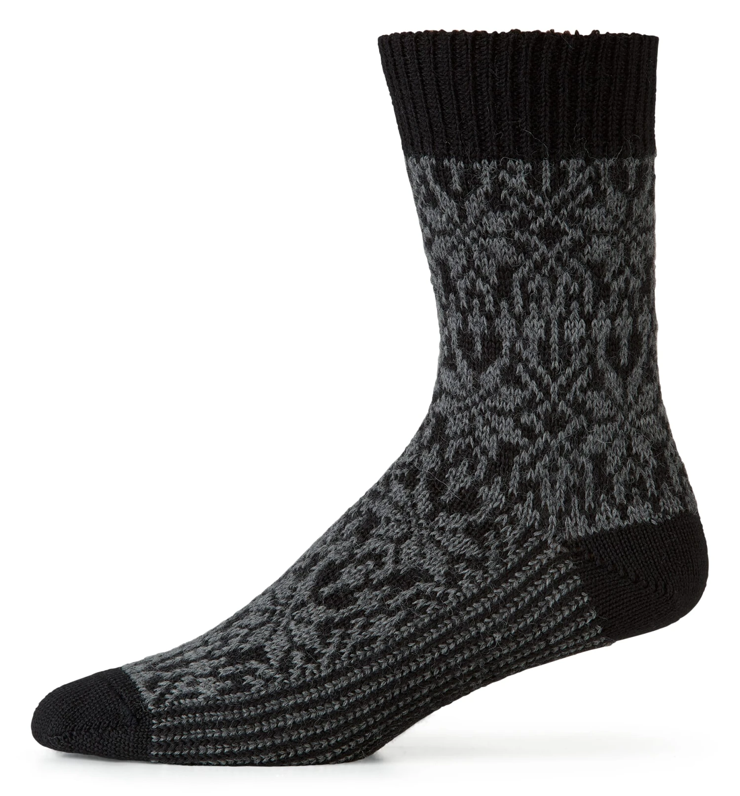 De fijne, duidelijk herkenbare sterpatronen van deze sokken ontstaan op speciaal uitgeruste jacquardbreimachines, waarop een garen van scheerwol driedraads wordt gebreid, zodat een sok met een goede pasvorm ontstaat. De voetzool is gebreid met patent, wat de pasvorm verder verbetert. De sok is zeker niet alleen geschikt voor comfortabele pantoffels, maar ook voor stevig winterschoeisel.