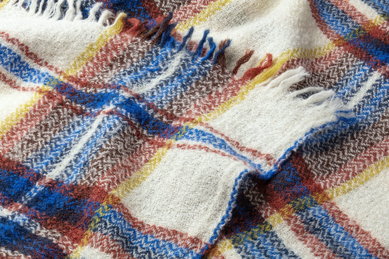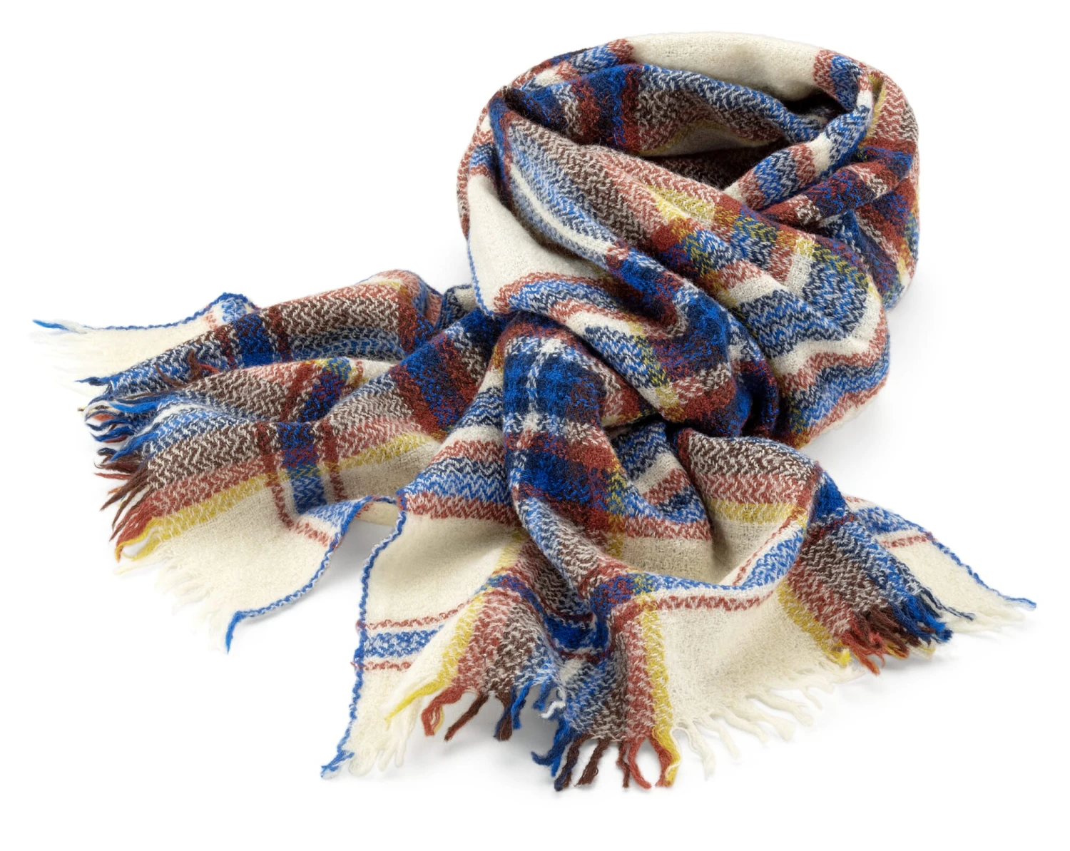 Deze vrij lichte sjaal van zachte, verwarmende wol heeft een fijn visgraatmotief in de weving waarover een opvallend ruitmotief ligt. Smalle franjes vormen de afwerking aan de uiteinden van de sjaal.