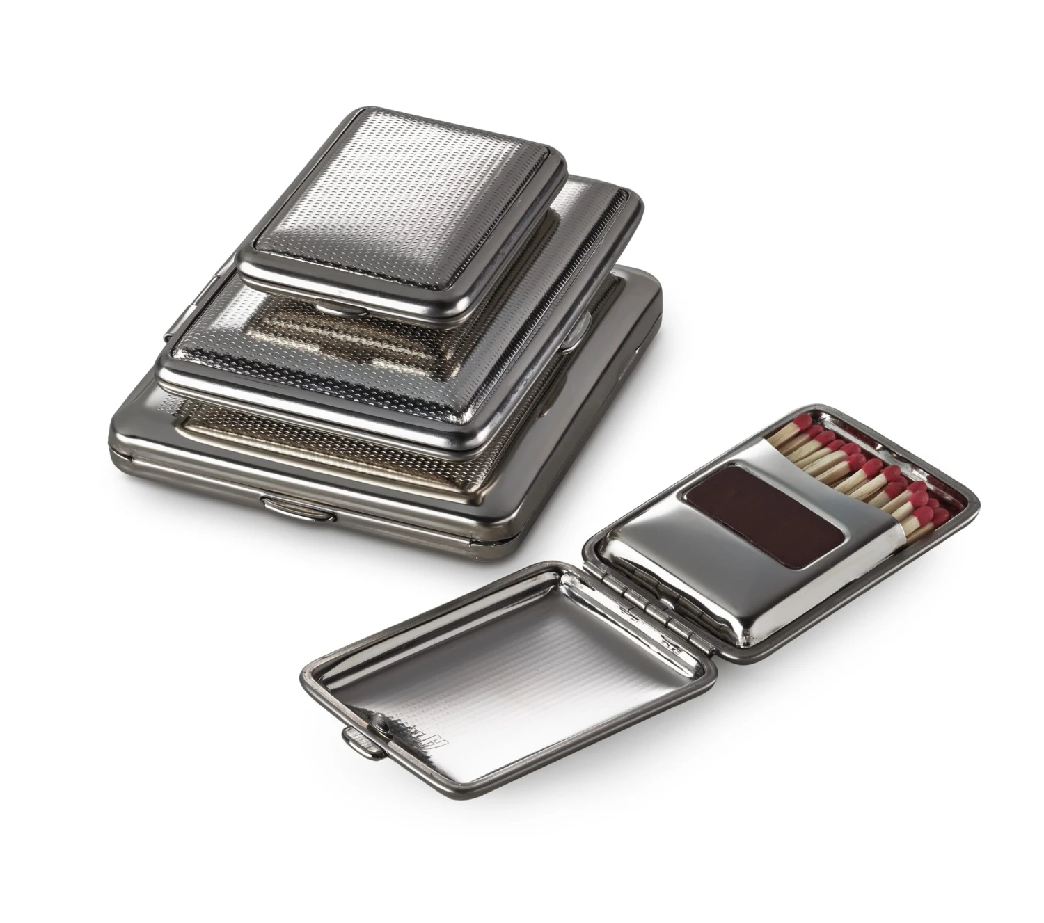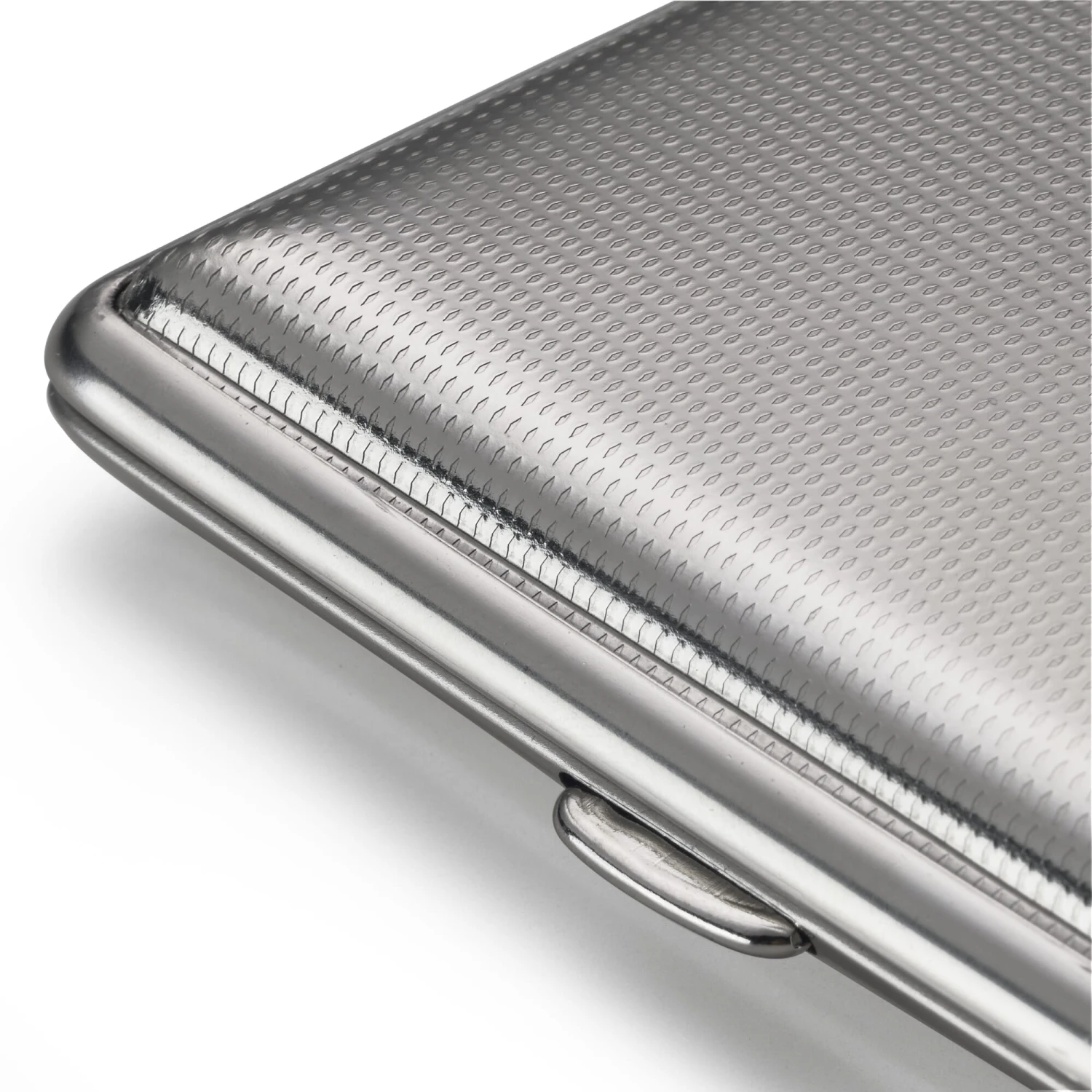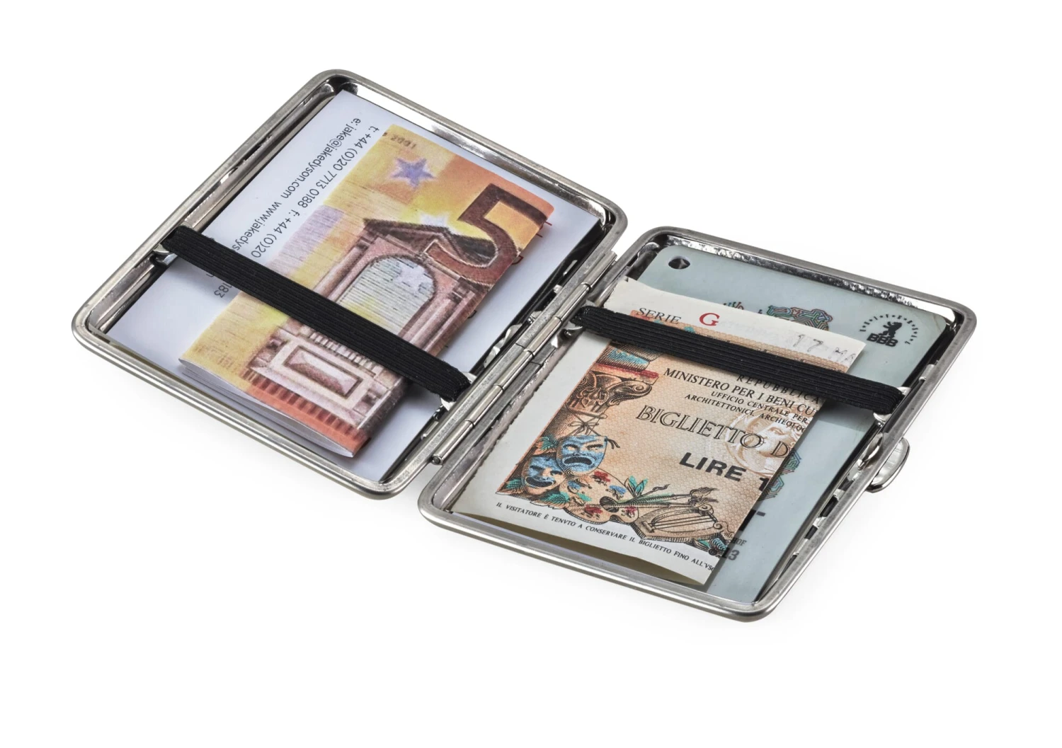 Geschikt voor kaarten tot 86 × 54 mm. Gemaakt van vernikkeld bandstaal. Elk met een rubberen band in de basis en het deksel. Gemaakt in Duitsland. Geleverd zonder inhoud. Breedte 9,5 cm, diepte 7 cm, hoogte 1,8 cm. Gewicht 70 g.