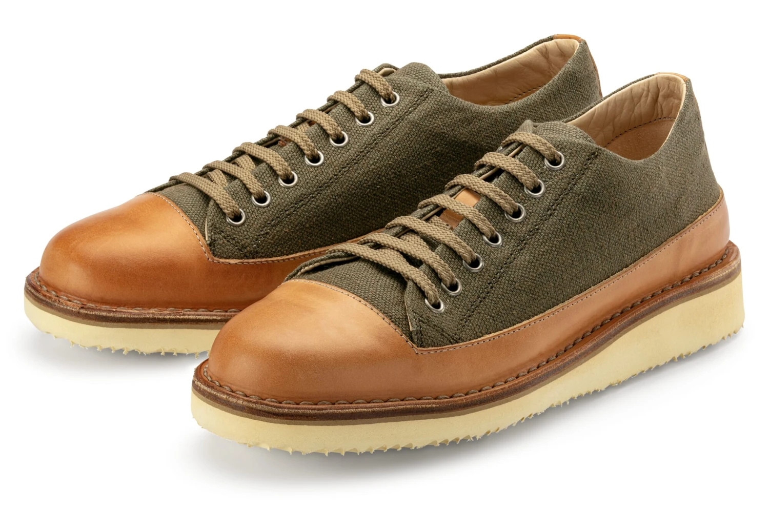 In deze opvallende casual schoen met een sportief karakter combineert Astorflex een sterk, olijfgroen katoenen canvas met een natuurlijk gekleurd rundleer. Voor een kleurrijk contrast zorgt de sterke buitenzool van lichtgekleurd EVA, die garant staat voor comfortabel en veilig lopen. Binnenin is de schoen volledig gevoerd met zacht leer, wat het draagcomfort verhoogt. De veters lopen door zeven paar metalen oogjes, waardoor de veters goed kunnen worden aangepast aan de individuele voetvorm. De binnenzool is uitneembaar en kan indien nodig vervangen worden door uw eigen inlegzool.