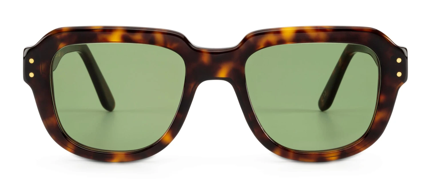 Het opvallende montuur van deze bril, geïnspireerd op modellen van eind jaren zestig, heeft een gemarmerde schildpad-look. Cellulose-acetaat is hiervoor het ideale materiaal, omdat echte schildpad – verkregen uit de schubben van zeeschildpadden – tegenwoordig om redenen van dierenwelzijn natuurlijk uit den boze is. De categorie 2 kunststof glazen met hun donkere tint zijn optimaal voor de zomerse zonnige dagen van onze breedtegraden.